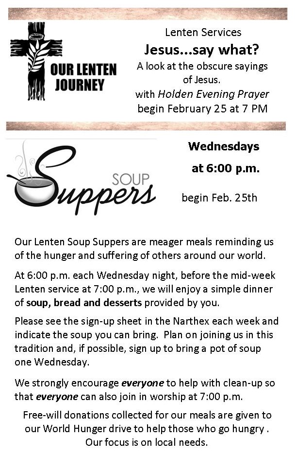 Tabor has been invited to join King of Kings Lutheran Church in their Lenten Soup Suppers and Worship Service on Wednesday evenings beginning February 25, 2026. 6:00pm Soup Supper, 7:00pm Worship service